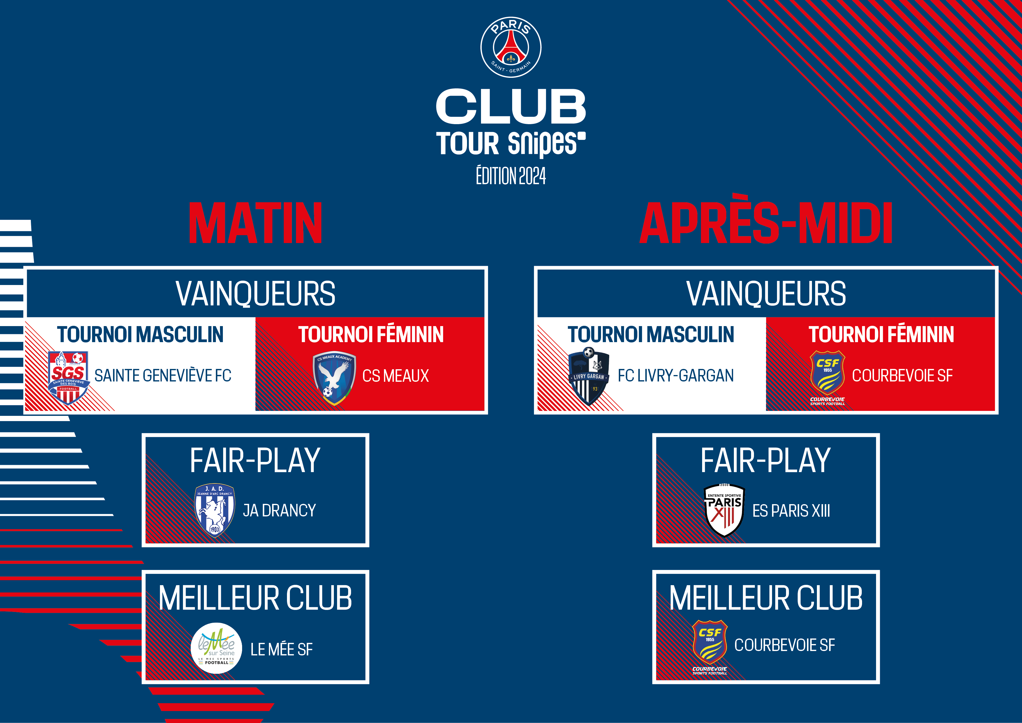 Le dimanche 21 avril 2024, s’est tenue la première édition de la Coupe du Club Tour Snipes. 576 enfants venus de toute l’Ile de France ont ainsi pu fouler la pelouse du nouveau centre d'entraînement du Paris Saint-Germain à Poissy, le Campus, pour participer à ce tournoi exceptionnel.